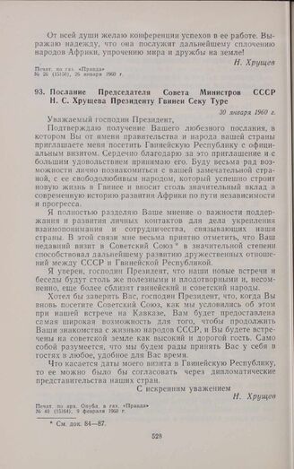 Послание Председателя Совета Министров СССР Н.С. Хрущева Президенту Гвинеи Секу Туре. 30 января 1960 г.