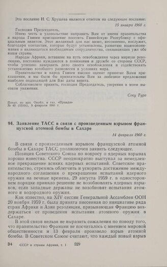 Заявление ТАСС в связи с произведенным взрывом французской атомной бомбы в Сахаре. 14 февраля 1960 г. // Печат. по газ. «Правда», № 45 (15169), 14 февраля 1960 г.