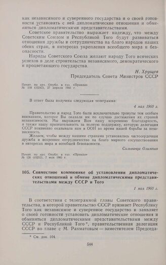 Совместное коммюнике об установлении дипломатических отношений и обмене дипломатическими представительствами между СССР и Того. 1 мая 1960 г. // Печат. по арх. Опѵбл. в газ. «Правда», № 126 (15250), 5 мая 1960 г.