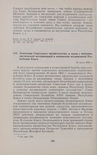 Заявление Советского правительства в связи с империалистической интервенцией в отношении независимой Республики Конго. 13 июля 1960 г. // Печат. по арх. Опубл. в газ. «Правда», № 196 (15320), 14 июля 1960 г.