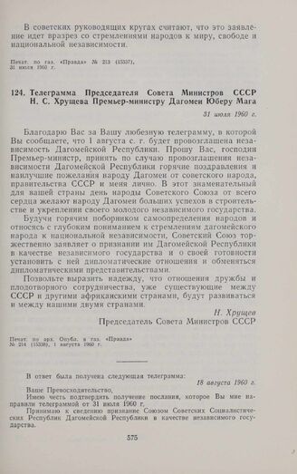 Телеграмма Председателя Совета Министров СССР Н.С. Хрущева Премьер-министру Дагомеи Юберу Мага. 31 июля 1960 г. // Печат. по арх. Опубл. в газ. «Правда», № 214 (15338), 1 августа 1960 г.