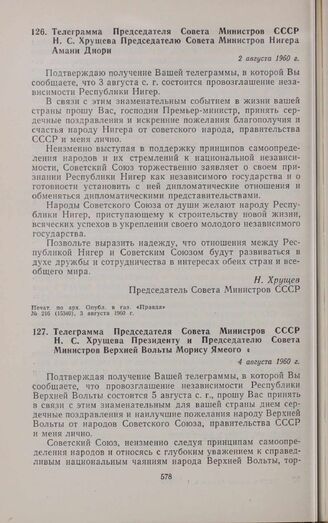 Телеграмма Председателя Совета Министров СССР Н.С. Хрущева Председателю Совета Министров Нигера Амани Диори. 2 августа 1960 г.