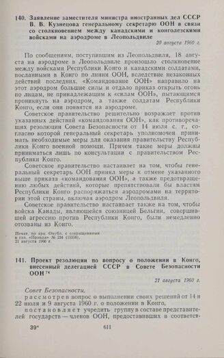 Проект резолюции по вопросу о положении в Конго, внесенный делегацией СССР в Совете Безопасности ООН. 21 августа 1960 г. // Печат. по арх. Опубл. в газ. «Правда», № 236 (15360), 23 августа 1960 г.
