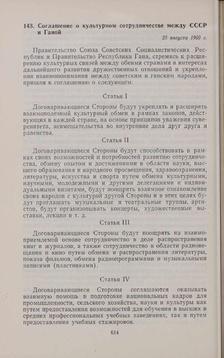Соглашение о культурном сотрудничестве между СССР и Ганой. 25 августа 1960 г. // Печат. по арх. Опубл. в «Ведомостях Верховного Совета СССР», № 28 (1063), 13 июля 1961 г.