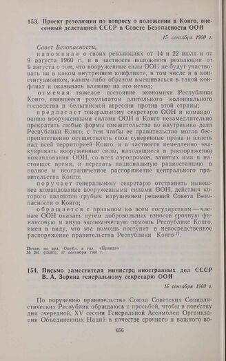 Проект резолюции по вопросу о положении в Конго, внесенный делегацией СССР в Совете Безопасности ООН. 15 сентября 1960 г. // Печат. по арх. Опубл. в газ. «Правда», № 261 (15385), 17 сентября 1960 г.