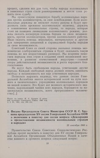 Письмо Председателя Совета Министров СССР Н.С. Хрущева председателю XV сессии Генеральной Ассамблеи ООН о включении в повестку дня сессии вопроса «Декларация о предоставлении независимости колониальным странам и народам». 23 сентября 1960 г. // Печат. по арх. Опубл. в изложении в газ. «Правда», № 268 (15392), 24 сентября 1960 г.