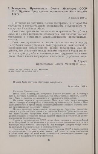 Телеграмма Председателя Совета Министров СССР Н.С. Хрущева Председателю правительства Мали Модибо Кейта. 8 октября 1960 г. // Печат. по арх. Опубл. в газ. «Правда», № 284 (15408), 10 октября 1960 г.