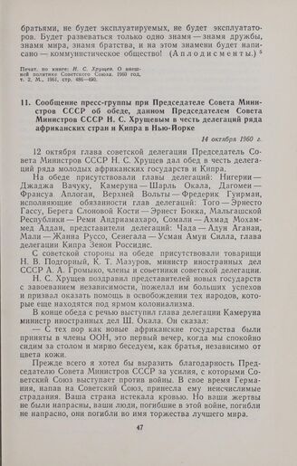 Сообщение пресс-группы при Председателе Совета Министров СССР об обеде, данном Председателем Совета Министров СССР Н.С. Хрущевым в честь делегаций ряда африканских стран и Кипра в Нью-Йорке. 14 октября 1960 г. // Печат. по газ. «Правда», № 288 (15412), 14 октября 1960 г.