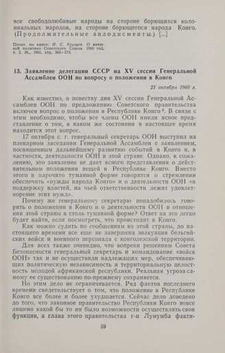 Заявление делегации СССР на XV сессии Генеральной Ассамблеи ООН по вопросу о положении в Конго. 21 октября 1960 г. // Печат. по газ. «Правда», № 297 (15421), 23 октября 1960 г.