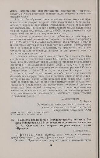 Главная СССР и страны Африки СССР и страны Африки. 1946-1962 гг. В 2 т. Т. 2. (сентябрь 1960 г.-... Документы Из ответов председателя Государственного комитета Совета Министров ...