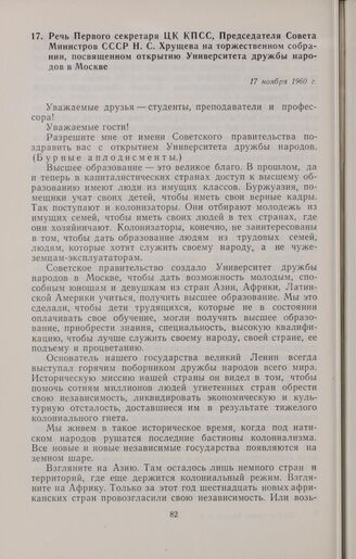 Речь Первого секретаря ЦК КПСС, Председателя Совета Министров СССР Н.С. Хрущева на торжественном собрании, посвященном открытию Университета дружбы народов в Москве. 17 ноября 1960 г.