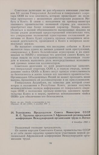 Телеграмма Председателя Совета Министров СССР Н.С. Хрущева председателю I Африканской региональной конференции Международной организации труда в Лагосе. 4 декабря 1960 г. // Печат. по арх. Опубл. в газ. «Правда», № 342 (15466), 7 декабря 1960 г.