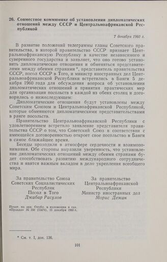 Совместное коммюнике об установлении дипломатических отношений между СССР и Центральноафриканской Республикой. 7 декабря 1960 г. // Печат. по арх. Опубл. в изложении в газ. «Правда», № 350 (15474), 15 декабря 1960 г.