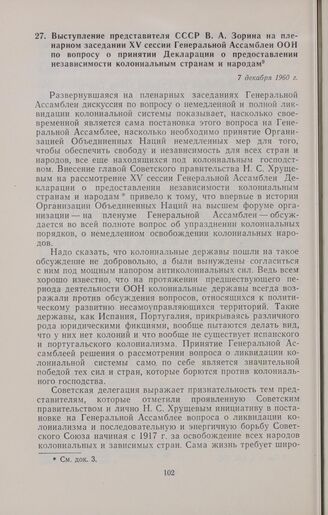 Выступление представителя СССР В.А. Зорина на пленарном заседании XV сессии Генеральной Ассамблеи ООН по вопросу о принятии Декларации о предоставлении независимости колониальным странам и народам. 7 декабря 1960 г.