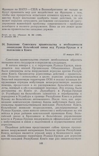 Заявление Советского правительства о необходимости ликвидации бельгийской опеки над Руанда-Урунди и о положении в Конго. 11 января 1961 г. // Печат. по арх. Опубл. в газ. «Правда», № 12 (15502), 12 января 1961 г.