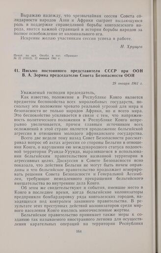 Письмо постоянного представителя СССР при ООН В.А. Зорина председателю Совета Безопасности ООН. 29 января 1961 г. // Печат. по арх. Опубл. в газ. «Правда», № 31 (15521), 31 января 1961 г.