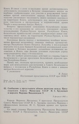 Сообщение о предстоящем обмене визитами между Председателем Совета Министров СССР Н.С. Хрущевым и королем Марокко Мохаммедом V. 2 февраля 1961 г. // Печат. по газ. «Правда», № 33 (15523), 2 февраля 1961 г.