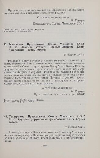 Телеграмма Председателя Совета Министров СССР Н.С. Хрущева супруге министра обороны Конго Мориса Мполо. 14 февраля 1961 г. // Печат. по арх. Опубл. в газ. «Правда», № 46 (15536), 15 февраля 1961 г.