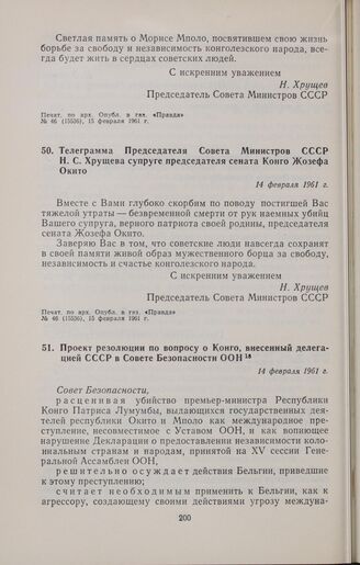 Телеграмма Председателя Совета Министров СССР Н.С. Хрущева супруге председателя сената Конго Жозефа Окито. 14 февраля 1961 г. // Печат. по арх. Опубл. в газ. «Правда», № 46 (15536), 15 февраля 1961 г.