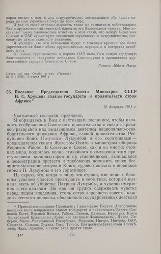 Послание Председателя Совета Министров СССР Н.С. Хрущева главам государств и правительств стран Африки. 22 февраля 1961 г.