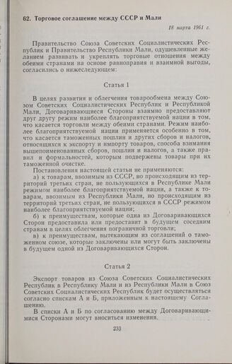 Торговое соглашение между СССР и Мали. 18 марта 1961 г. // Печат. по арх. Опубл. в журнале «Внешняя торговля», 1961 г., № 5, стр. 55-56.