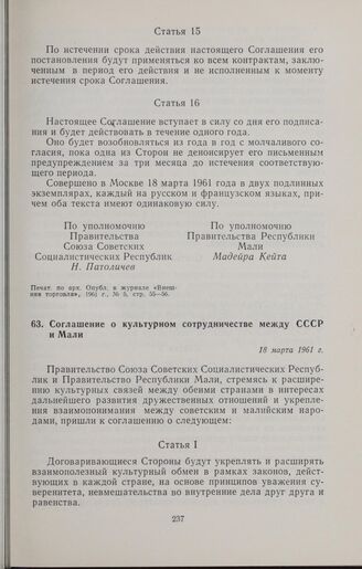 Соглашение о культурном сотрудничестве между СССР и Мали. 18 марта 1961 г. // Печат. по арх.