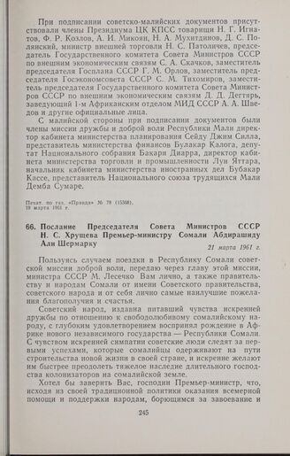 Послание Председателя Совета Министров СССР Н.С. Хрущева Премьер-министру Сомали Абдирашиду Али Шермарку. 21 марта 1961 г. // Печат. по арх.