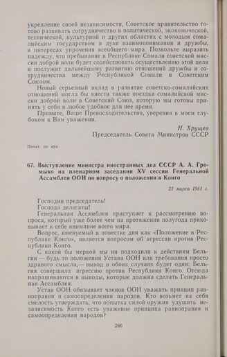 Выступление министра иностранных дел СССР А.А. Громыко на пленарном заседании XV сессии Генеральной Ассамблеи ООН по вопросу о положении в Конго. 21 марта 1961 г. // Печат. по арх. Опубл. в изложении в газ. «Правда», № 81 (15571), 22 марта 1961 г.