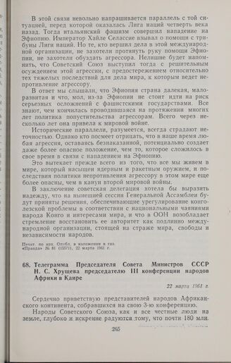 Телеграмма Председателя Совета Министров СССР Н.С. Хрущева председателю III конференции народов Африки в Каире. 22 марта 1961 г. // Печат. по арх. Опубл. в газ. «Правда», № 84 (15574), 25 марта 1961 г.