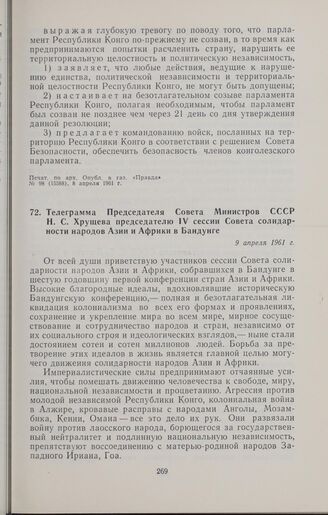 Телеграмма Председателя Совета Министров СССР Н.С. Хрущева председателю IV сессии Совета солидарности народов Азии и Африки в Бандунге. 9 апреля 1961 г. // Печат. по арх. Опубл. в газ. «Правда», № 100 (15590), 10 апреля 1961 г.