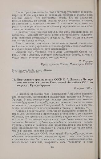 Выступление представителя СССР С.Г. Лапина в Четвертом комитете XV сессии Генеральной Ассамблеи ООН по вопросу о Руанда-Урунди. 10 апреля 1961 г. // Печат. по арх.