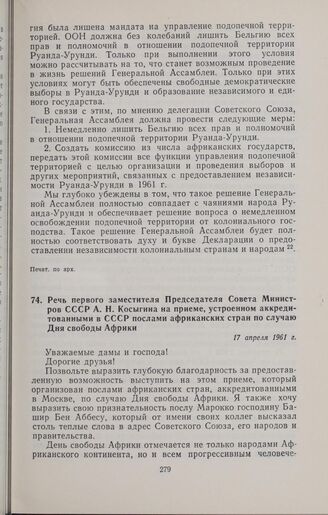 Речь первого заместителя Председателя Совета Министров СССР А.Н. Косыгина на приеме, устроенном аккредитованными в СССР послами африканских стран по случаю Дня свободы Африки. 17 апреля 1961 г. // Печат. по газ. «Правда», № 108 (15598). 18 апреля 1961 г.
