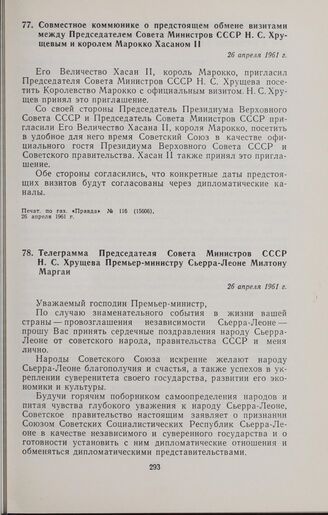 Совместное коммюнике о предстоящем обмене визитами между Председателем Совета Министров СССР Н.С. Хрущевым и королем Марокко Хасаном II. 26 апреля 1961 г. // Печат. по газ. «Правда», № 116 (15606), 26 апреля 1961 г.