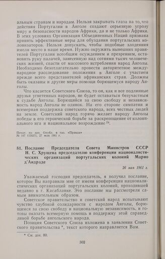 Послание Председателя Совета Министров СССР Н. С. Хрущева председателю конференции националистических организаций португальских колоний Марио д’Андраде. 26 мая 1961 г. // Печат. по арх. Опубл. в газ. «Правда», № 167 (15657), 16 июня 1961 г.