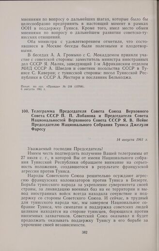 Телеграмма Председателя Совета Союза Верховного Совета СССР П.П. Лобанова и Председателя Совета Национальностей Верховного Совета СССР Я.В. Пейве Председателю Национального Собрания Туниса Джелули Фаресу. 14 августа 1961 г. // Печат. по арх. Опубл. в газ. «Правда», № 231 (15721), 18 августа 1961 г.