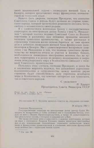 Главная СССР и страны Африки СССР и страны Африки. 1946-1962 гг. В 2 т. Т. 2. (сентябрь 1960 г.-... Документы Послание Президента Туниса Хабиба Бургибы Председателю Совета Минис...