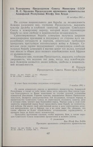 Ответная телеграмма Председателя временного правительства Алжирской Республики Юсефа Бен Хедды Председателю Совета Министров СССР Н.С. Хрущеву. 3 ноября 1961 г.
