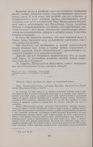 Речь Председателя Верховного совета вооруженных сил и Премьер-министра Судана И. Аббуда на ужине в Хартуме. 16 ноября 1961 г. // Печат. по арх.