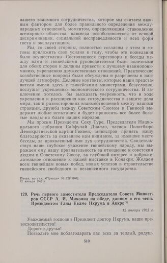 Речь первого заместителя Председателя Совета Министров СССР А.И. Микояна на обеде, данном в его честь Президентом Ганы Кваме Нкрума в Аккре. 12 января 1962 г. // Печат. по газ. «Правда», № 14 (15870), 14 января 1962 г.