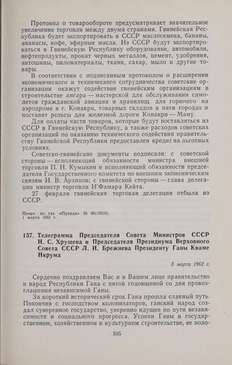 Телеграмма Председателя Совета Министров СССР Н.С. Хрущева и Председателя Президиума Верховного Совета СССР Л.И. Брежнева Президенту Ганы Кваме Нкрума. 5 марта 1962 г. // Печат. по арх. Опубл. в газ. «Правда», № 65 (15921), 6 марта 1962 г.