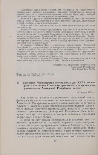 Заявление Министерства иностранных дел СССР по вопросу о признании Советским правительством временного правительства Алжирской Республики де-юре. 28 марта 1962 г. // Печат. по арх. Опубл. в газ. «Правда», № 87 (15943), 28 марта 1962 г.