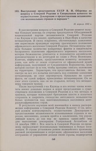 Выступление представителя СССР В.И. Оберемко по вопросу о Северной Родезии в Специальном комитете по осуществлению Декларации о предоставлении независимости колониальным странам и народам. 26 апреля 1962 г.