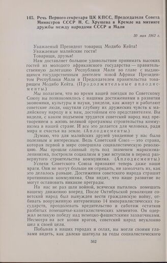 Речь Первого секретаря ЦК КПСС, Председателя Совета Министров СССР Н.С. Хрущева в Кремле на митинге дружбы между народами СССР и Мали. 30 мая 1962 г.
