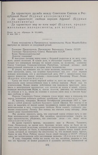 Речь Главы государства и Председателя правительства Мали Модибо Кейта в Кремле на митинге дружбы между народами СССР и Мали. 30 мая 1962 г. // Печат. по газ. «Правда», № 151 (16007), 31 мая 1962 г.