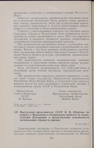Выступление представителя СССР В.И. Оберемко по вопросу о Ньясаленде в Специальном комитете по осуществлению Декларации о предоставлении независимости колониальным странам и народам. 31 мая 1962 г. // Печат. по арх.