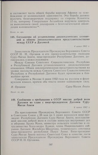 Сообщение о пребывании в СССР миссии доброй воли Дагомеи во главе с вице-президентом Дагомеи Суру- Миган Апити. 6 июня 1962 г. // Печат. по газ. «Правда», № 157 (16013), 6 июня 1962 г.