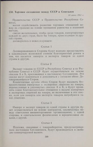 Торговое соглашение между СССР и Сенегалом. 14 июня 1962 г. // Печат. по арх. Опубл. в журнале «Внешняя торговля», 1962 г., № 10, стр. 50-51.