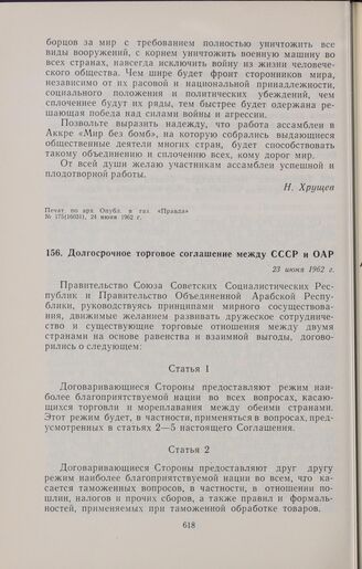 Долгосрочное торговое соглашение между СССР и ОАР. 23 июня 1962 г. // Печат. по арх.