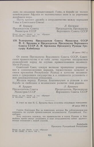 Телеграмма Председателя Совета Министров СССР Н.С. Хрущева и Председателя Президиума Верховного Совета СССР Л.И. Брежнева Президенту Руанды Грегуару Кайибанда. 30 июня 1962 г. // Печат. по арх. Опубл. в газ. «Правда», № 182 (16038), 1 июля 1962 г.
