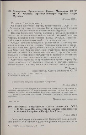 Телеграмма Председателя Совета Министров СССР Н.С. Хрущева Председателю временного правительства Алжирской Республики Юсефу Бен Хедда. 3 июля 1962 г. // Печат. по арх. Опубл. в газ. «Правда», № 185 (16041), 4 июля 1962 г.